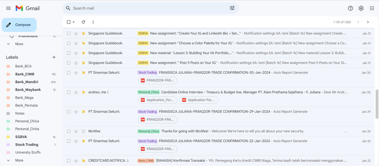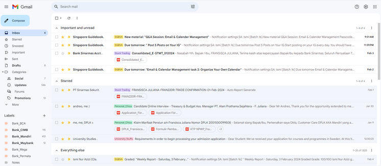 Emails organized and sorted into sections
