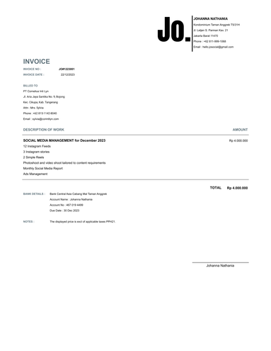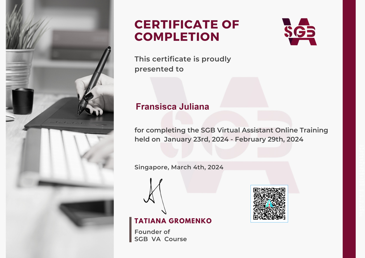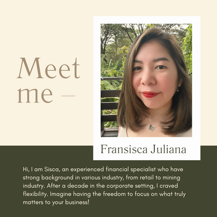 Hello! I am Fransisca Juliana, I was a financial specialist turned into a full-time virtual executives for entrepreneurs and businesses. Leveraging my 14+ years of experience in optimizing profit and developing system with multiply companies. I understand the value of organization and efficiency. Now, I am here as a trusted partner to help you in achieving operational excellent and optimizing tasks for your business, and allowing you to focus on the core aspects without the hassle of managing everything.